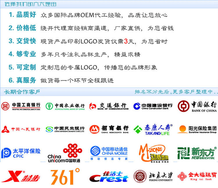 本工廠注重打造產(chǎn)品的品質(zhì),服務(wù),客戶的精準貨期,讓客戶下單之后無后顧之憂。銷售網(wǎng)絡(luò)已經(jīng)遍布全國,在全國部分城市設(shè)立有辦事處,歡迎空白區(qū)域的禮品商,商超、禮品公司,廣告公司,批發(fā)渠道商合作,共同打造集團化的優(yōu)勢,共創(chuàng)美好未來。
